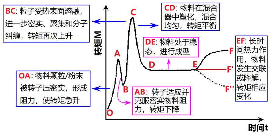 CD:物料在混合器中塑化,逐渐均匀。达到平衡,转矩下降到D。