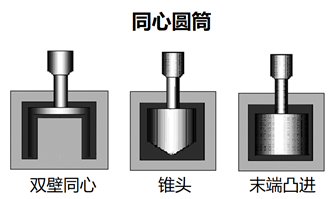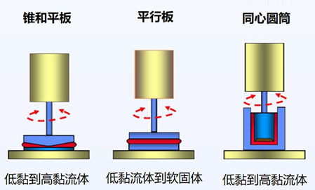 旋转流变仪通常具有三种测量头系统,即锥和平板、平行板和同心圆筒(又分末端凸进、锥头和双璧同心三种),如图所示。