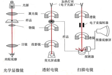 光学显微镜、透射电镜与扫描电镜的“光”路对比