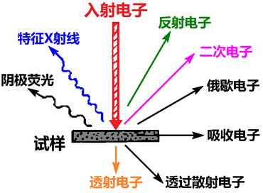 一束电子射到试样上,电子与物质相互作用,当电子的运动方向被改变时,称为散射。    但当电子只改变运动方向而电子的能量不发生变化时,称为弹性散射。如果电子的运动方向和能量同时发生变化,称为非弹性散射。电子束与固体试样相互作用可得到如图所示的各种信息。