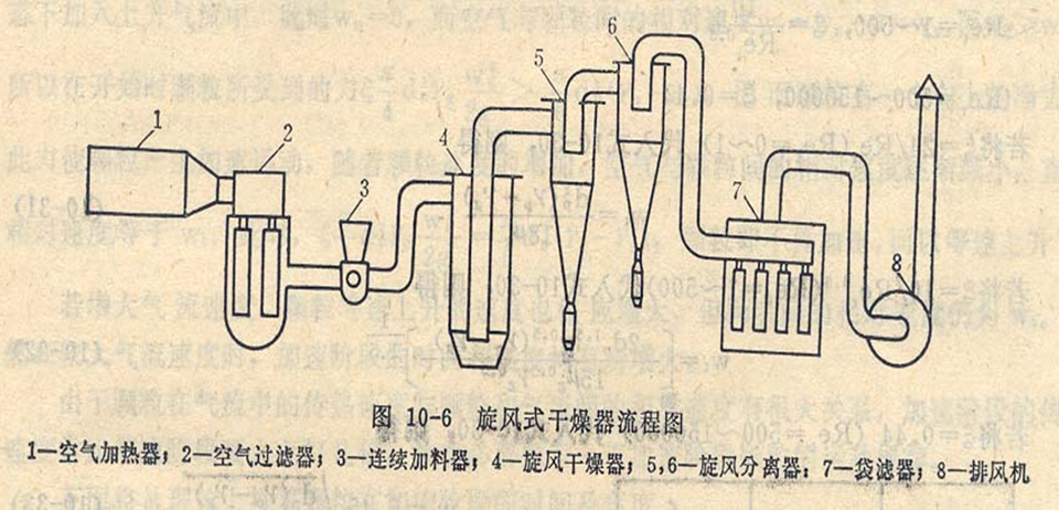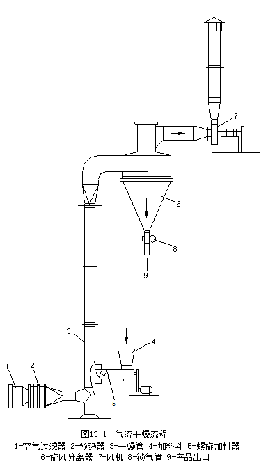 3. 气流干燥流程:湿物料由加料斗4经加料器5送入气流干燥3。空气通过空气过滤器1滤取灰尘,经加热器2加热到一定温度后送入干燥管。由于热气流的高速流动,物料颗粒分散于气流之中,气固两相之间发生传热和传质作用,使物料获得干燥。已干燥的物料随气流带出,经分离器6分离气体和固体,产品通过锁气器8从出口9卸出。废气经风机7排走。