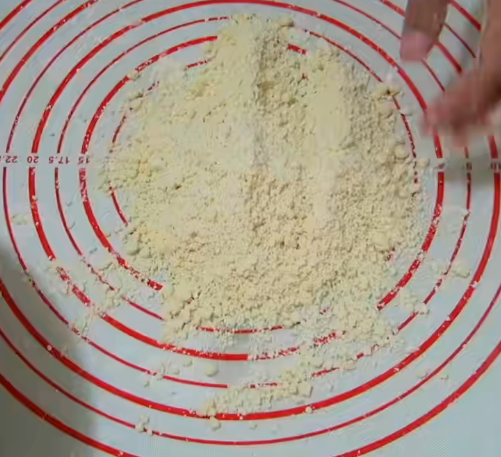 1)注意抹面手法,需要用手掌摩擦面粉与硬黄油块,使面粉粘到黄油块上,再通过摩擦,使面粉从黄油块脱落,最终成为浅黄色的面粉黄油小颗粒。
