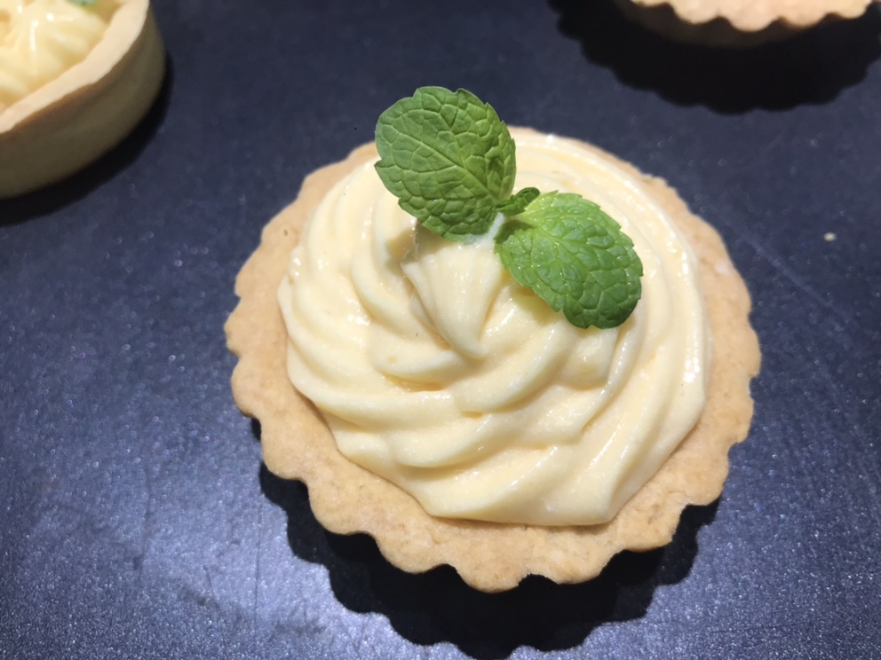 4.将沙布雷挞皮挞底与绿柠檬慕斯奶油组合形成绿柠檬奶油小挞。