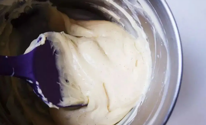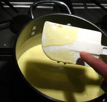 2)煮制牛奶鸡蛋混合物时,应使用奶油软刮刀以划桨的手法不停触碰锅底进行搅拌,以免混合物粘底煮焦。
