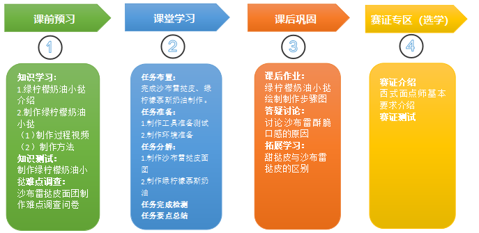 3.情感态度与价值观目标:通过自主学习制作绿柠檬奶油小挞,树立自主钻研、精益求精的职业精神。