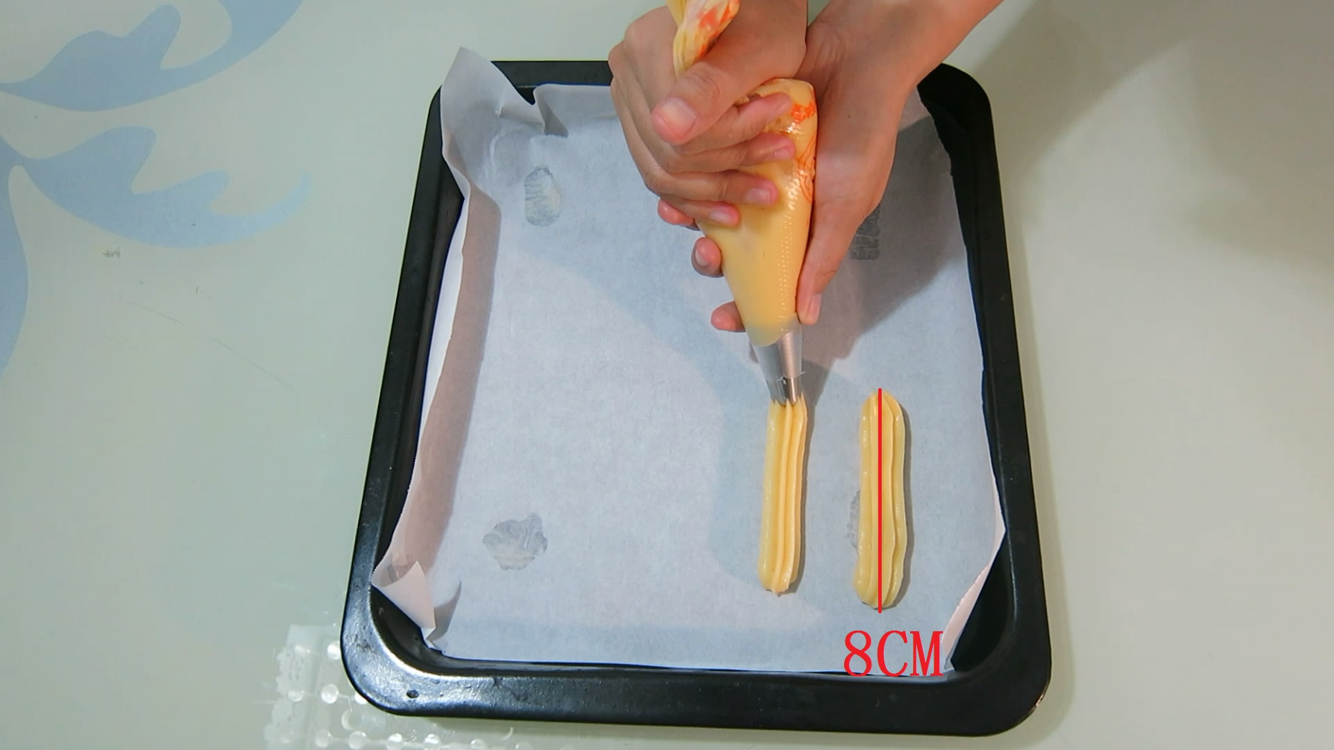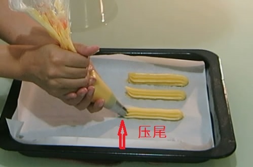 (2)匀速挤压泡芙面团,同时向后移动,均匀的挤出泡芙面团,长约8CM。