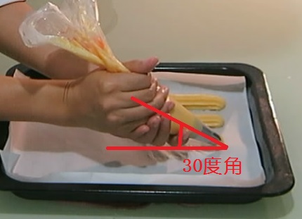 (1)手持泡芙面团,裱花嘴与烤盘间的角度为30度。