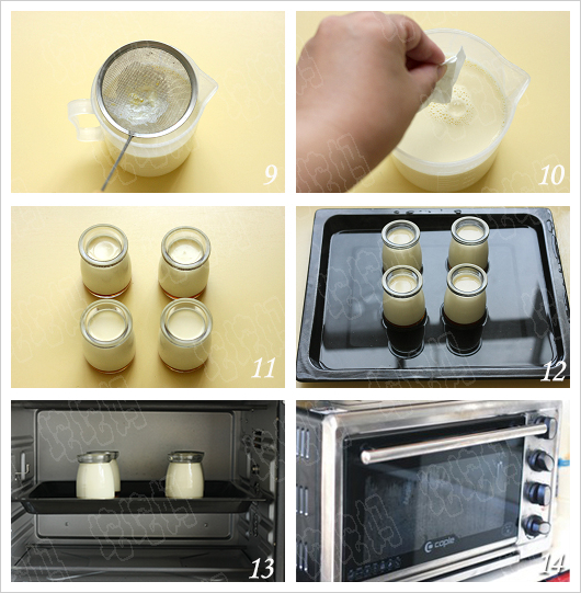 5)蛋奶液倒入布丁模具中,盖在焦糖上,用保鲜膜封住杯口。然后用水浴法进行烘焙:将布丁模放在一个深烤盘中,望烤盘里倒入3CM的沸水,将烤盘放入烤箱,165度烤约45分钟-1小时。