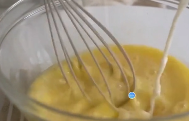 3)将鸡蛋搅拌成蛋液,将热牛奶缓慢倒入蛋液中(同时用打蛋器进行搅拌)。