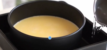 水浴法是烘焙的一种方法,通过在烤盘中加入水,在烘烤加热过程中通过水把热量传递(热传递)需要加热烘烤的焦糖蛋奶布丁,达到加热的目的。同时因为水被加热,形成水蒸气,使被烘焙的甜品表面形成水膜层,能够保持甜品表面的嫩滑质感。