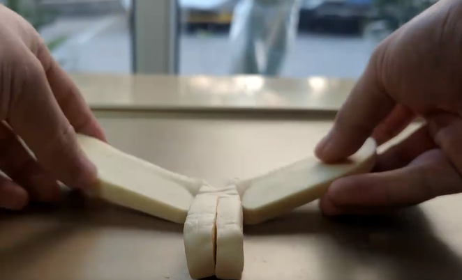 (3)折叠次数最好控制在三折六次或四折四次,每次折叠后必须冷藏足够的时间,让面团有充分时间松弛,否则起筋太多容易造成黄油层断裂。