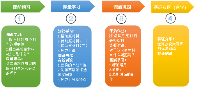 3.情感态度与价值观目标:认识甜点制作的基础原材料以及辅助原材料,为实践操作制作甜点品种做好准备。
