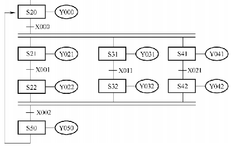 S20为分支状态,只不过其分支不是选择性的,也就是说一旦状态S20的转移条件X0为ON,三个顺序流程同时执行,所以称之为并行分支。S50为汇合状态,等三个分支流程动作全部结束时,一旦X3为ON,S50就开启。若其中一个分支没有执行完,S50就不可能开启,所以又叫做排队汇合。
