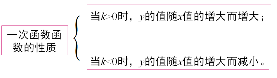 在一次函数y=kx+b中,当k>0时,y的值随着x值的增大而增大;当k<0时,y的值随着x值的增大而减小。