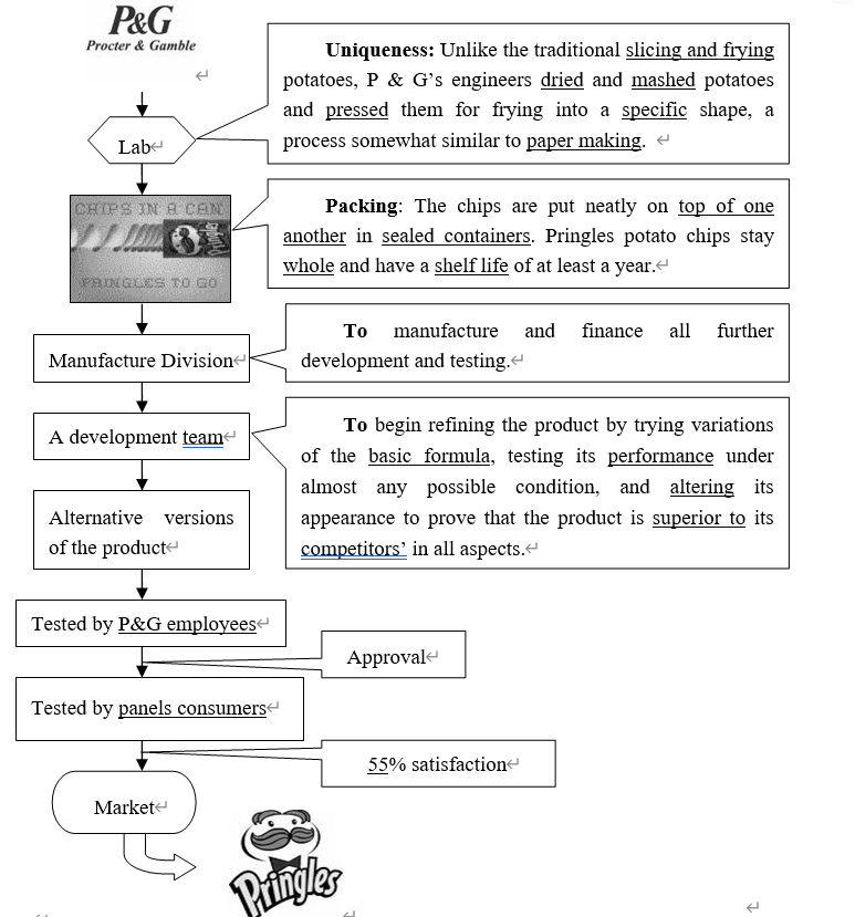 Instead of slicing potatoes and frying them in the traditional way, Procter & Gamble’s engineers developed a process somewhat similar to paper making. They dried and mashed potatoes and pressed them for frying into a specific shape, which permitted the chips to be put neatly on top of one another in sealed containers. Pringles potato chips stay whole and have a shelf life of at least a year. After a new product is screened through the lab, the division that will manufacture it takes over and finances all further development and testing. Before a new Procter & Gamble product is actually introduced to the market, it must prove that the product is superior to its competitors’ in all aspects. A development team begins refining the product by trying variations of the basic formula, testing its performance under almost any possible condition, and altering its appearance. Eventually, a few alternative versions of the product are produced and tested among a large number of Procter & Gamble employees. If the product gets the approval of employees, the company presents it to panels of consumers for further testing. Procter & Gamble feels satisfied if a future product is chosen by fifty-five out of one hundred consumers tested. There is hardly any doubt that, if an innovation is successful, it pays off lavishly.