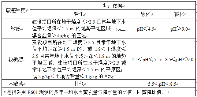 建设项目所在地土壤环境敏感程度分为敏感、较敏感、不敏感,判别依据见表1;同一建设项目涉及两个或两个以上场地或地区,应分别判定其敏感程度;产生两种或两种以上生态影响后果的,敏感程度按相对最高级别判定。