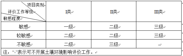 根据识别的土壤环境影响评价项目类别(详见10.5.1中附录A,将建设项目划分为I、II、III、IV类,其中IV类项目可不进行土壤环境影响评价)与敏感程度分级结果划分评价工作等级,详见表 2。