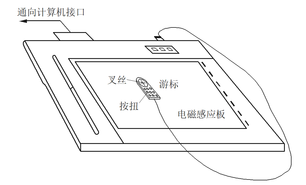 手扶跟踪数字化仪是用来记录和跟踪图形中点、线位置的手工数字化设备,主要由电磁感应板、游标和相应的电子电路组成。