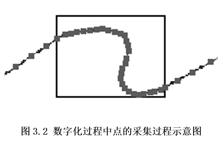 线采集时,直线段通过数字化线段的两个端点来记录,曲线则是通过对于组成它的一系列折线的数字化来记录。需要注意的是:在线的弯曲或拐点处(图3.2中线在矩形框内的部分)应增加采点的数量,以保证数据录入的精度。