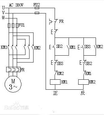 图中使用了2个分别用于正转和反转的电磁接触器KM1、KM2,对这个电动机进行电源电压相的调换。此时,如果正转用电磁接触器KM1,电源和电动机通过接触器KM1主触头,使L1相和U相、L2相和V相、L3相和W相对应连接,所以电动机正向转动。如果接触器KM2动作,电源和电动机通过KM2主触头,使L1相和W相、L2相和V相、L3相和U相分别对应连接,因为L1相和L3相交换,所以电动机反向转动。