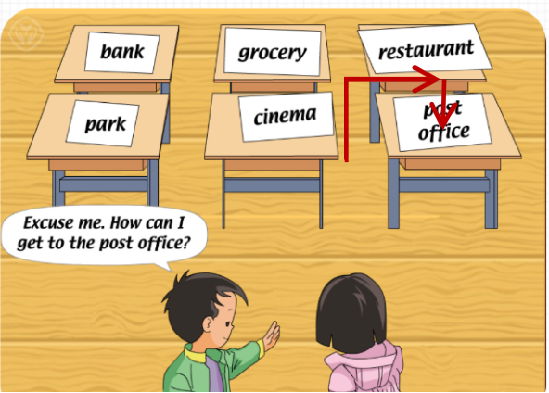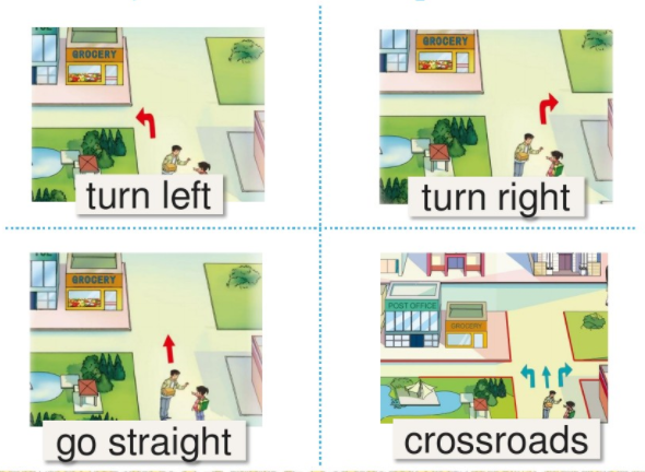 1. 认识并会说 go straight,turn left,turn right 等表示行进方向的词汇。
