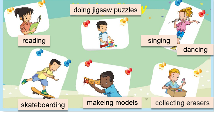 1. 认识 hobby, reading, doing jigsaw puzzles, singing, dancing, skateboarding, making models, collecting erasers 等描述兴趣爱好的词汇,能够根据语境恰当使用,借助拼读规律记忆。