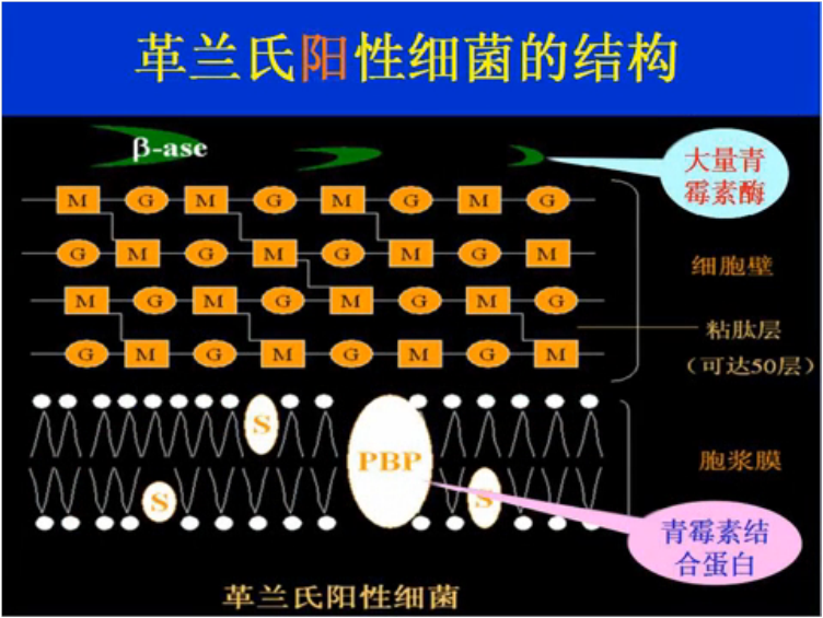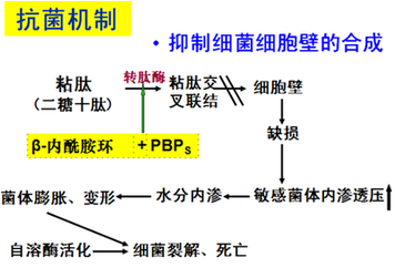 青霉素与敏感菌胞浆膜上青霉素结合蛋白(PBPs)结合,抑制转肽酶活性,阻止粘肽合成,造成细胞壁缺损,由于敏感菌菌体内渗透压高,使水分子不断内渗,以致菌体膨胀破裂死亡。