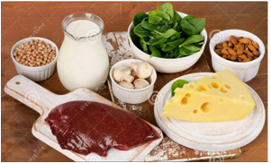 来源于酵母、肝、肾、肉类、蛋、奶、大豆等。