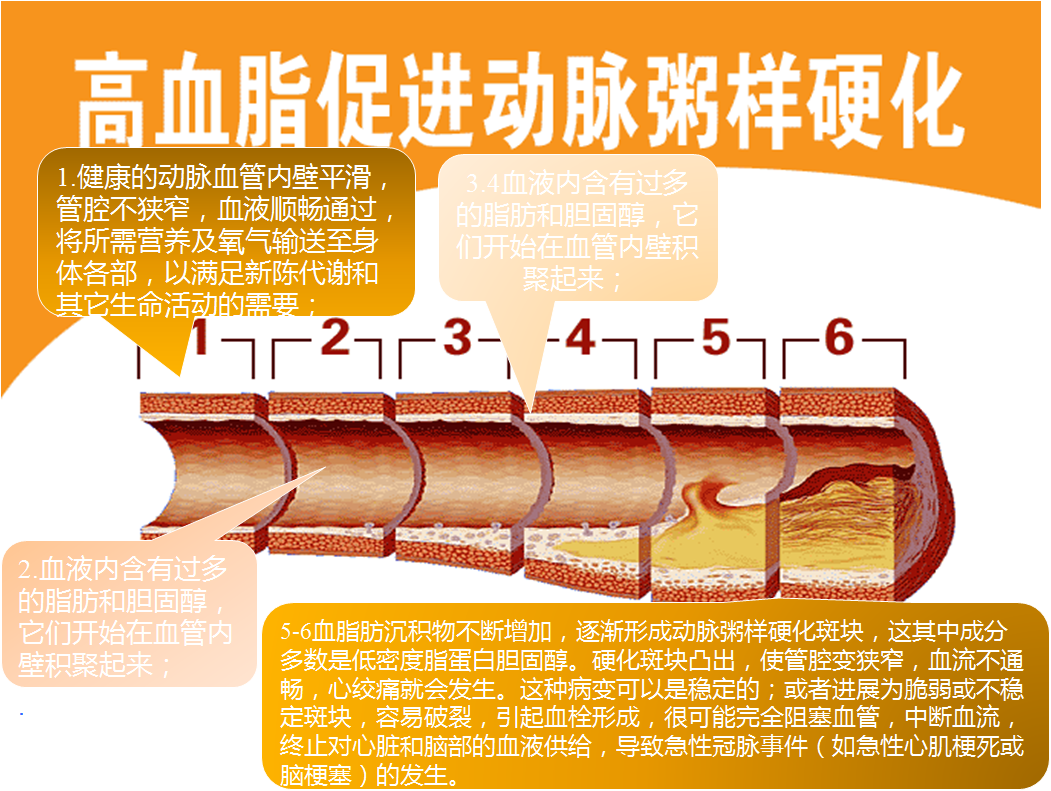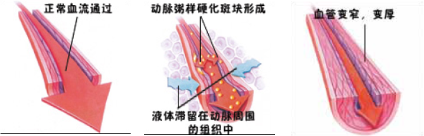 3~4. 初期血管内壁出现脂肪状沉积,并令血管向外肿胀,此时,高脂血症这个“无声的杀手”已将动脉粥样硬化病变悄悄地潜藏在人体内;