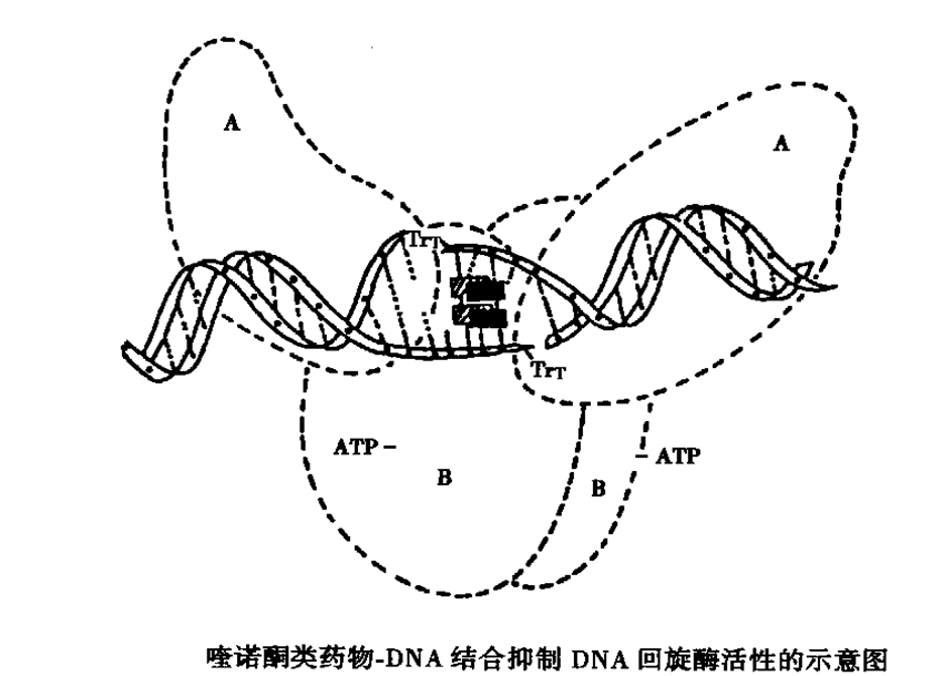 氟喹诺酮类通过抑制DNA回旋酶,干扰 DNA复制、转录、重组,阻碍DNA合成而致菌体死亡