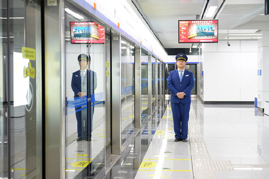 列车停妥后,走到附近扶梯口对应的车门前,指引乘客上下车。确认车门、屏蔽门全部打开。当列车准备关门时,平展手臂,阻止乘客抢上抢下(无论有无乘客,均要平展手臂作阻挡姿势),但不能拉扯乘客。