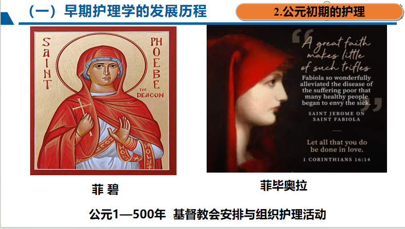 Phoebe 菲碧:在基督教会的早期(约公元 50 年),圣保罗派了一位名叫菲碧的女执事到罗马,她是第一任女执事。她很聪明,受过教育,是最好的护士,可以在家中照顾病人。她可以与现代公共卫生护士相提并论。她组织修女建立了护理团体,使护理组织化和社会化。
