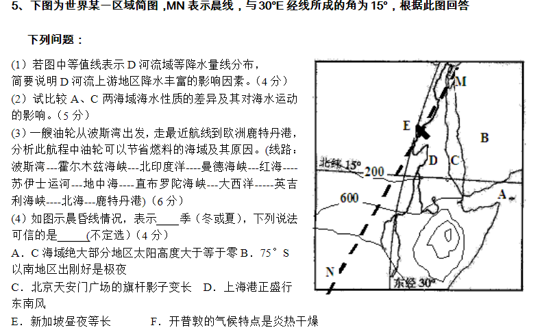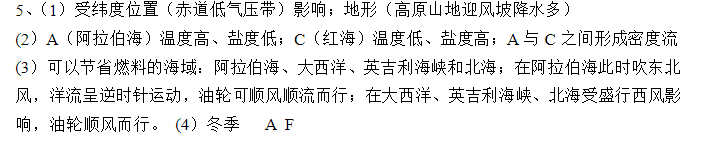 (5) 图中④代表 气候,冬季吹 风,来自 ,因而降水较 ;夏季受 控制,降水 ;图中⑤代表 气候。