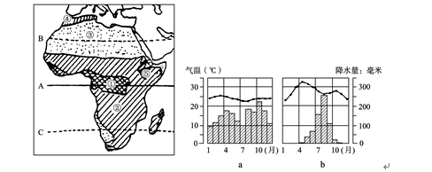 (2) 图中A附近受 气压带控制,盛行 气流,降水 ,因而形成① 气候类型区;该气候类型相应的“气温—降水曲线”为 a或b。
