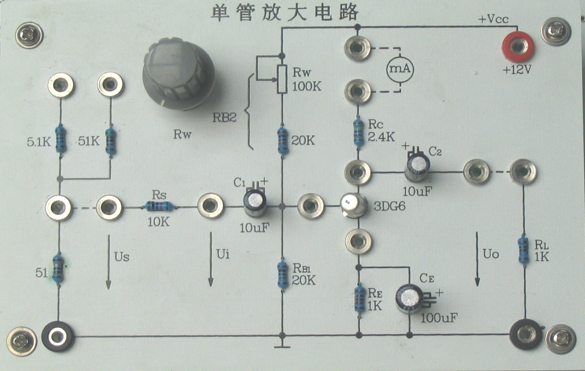 实验电路如图2-1所示, 接通+12V电源,调整Rw(偏置电位器),使VE=2.0V,测量晶体管的静态电位VB、VE、VC,并计算UCE、IC、IB的值,将测试结果记录在相应表格中。