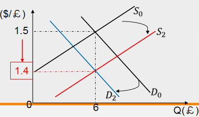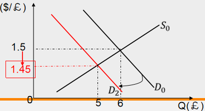 Thus, the demand curve for pounds shift to left, causing the dollar price of pounds to decrease from 1.5 to 1.45.