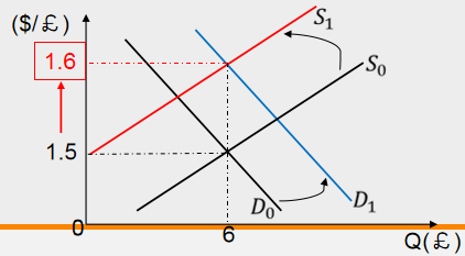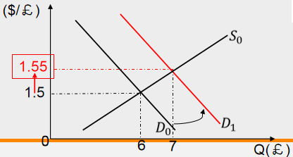 Then, the dollar price of pounds will rise from $1.5/£ to $1.6/£.