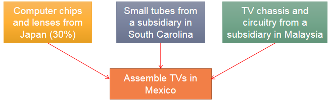 In particular, the small tubes came from a subsidiary in South Carolina, denominated in dollars. And, TV chassis and circuitry came from a subsidiary in Malaysia, denominated in dollars. While, only computer chips and lenses came from Japan that amounted to 30% of the value of the parts used in one TV set. In the end, another Hitachi's subsidiary in Mexico assembled the TVs, where the assembling costs such as labor costs were denominated in peso which depreciated against dollar.