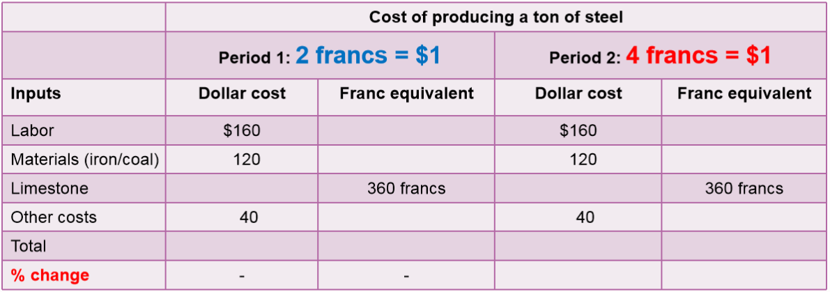 As we can see, due to the 100% dollar appreciation, the franc costs of labor, iron, coal and other inputs increase by 100%; while, becasue limestone was priced in francs, the franc cost of limestone remains unchanged at 360 francs.