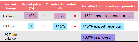 Under the UK demand elasticity for imports of 2.5, a 10% rise in pound price of UK imports would lead to a 25% decline in the quantity of UK imports demanded.