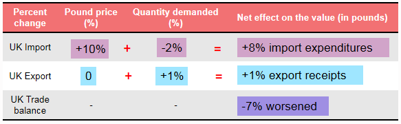 Thereby, 10% rise in pound price of UK import along with 2% decline in quantity of UK import demanded lead to 8% rise in the value of UK imports (=10%+(-2%)).