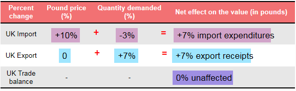Therefore, UK trade balance is unaffected by a pound depreciation when the sum of elasticities equals 1.
