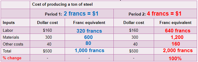 In period 1, the firm’s production cost per ton of steel is $500, equivalent to 1000 francs at the ex-rate $0.5/SFr.