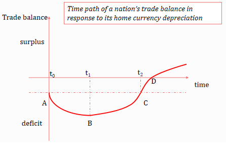 After home currency's depreciation, the nation's trade balance continues to get worse in the very short term; but as time passes, the trade balance will likely improve, assuming that the demand elasticities are high. And, the description of the time path of trade flows is so called J-curve effect.