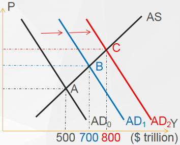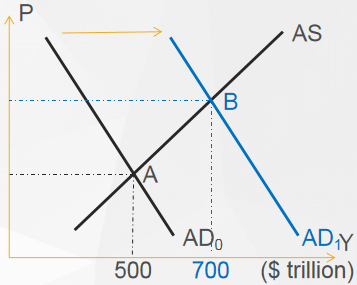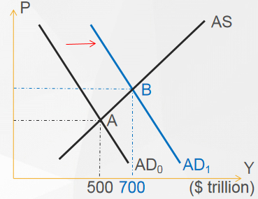 This increase causes equilibrium real GDP to rise from 500 to 700 trillion dollars.