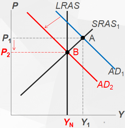 In particular, to offset the high inflation, the central bank can decrease the money supply by selling securities in open market and the interest rate will rise. A higher interest rate will reduce consumption and investment spending, thus decreasing the aggregate demand. The AD curve shifts to left, so the price level will decline.