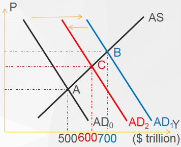 So, this purchase causes the domestic money supply to decrease, causing the consumption and investment spending to decline. Then, the aggregate demand would decline from AD1 to AD2.