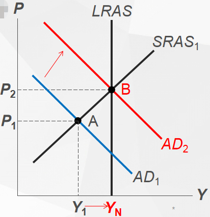 In particular, to end the recession, an expansionary monetary policy is implemented that increases the money supply and reduces the interest rate. A lower interest rate will encourage consumption and investment spending, thus raise the aggregate demand, shifting the AD curve to right until achieveing the full employment level of real GDP at point B.