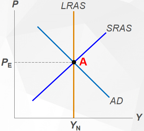 The economy is in equilibrium where the AD curve intersects the AS curve. This intersection determines the equilibrium price level and output for the economy.