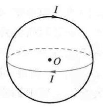 b:在球面竖直和水平两个方向分别通以相同的电流,电流流向如图所示,问,球面中心O出磁感应强度如何?